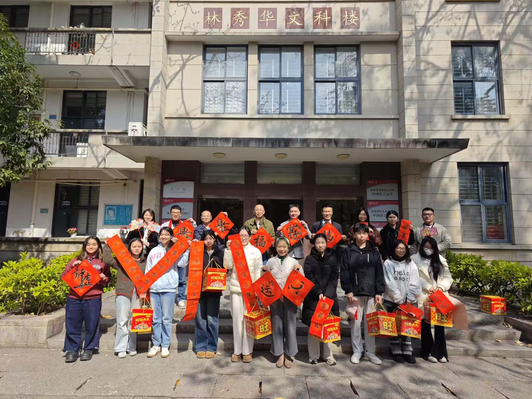 交流结束后,开展了写春联送祝福活动。师生与嘉宾们铺展红纸、提笔沾墨,在一笔一画中体验传统年俗的独特魅力。笔墨飘香间,一幅幅春联为留校学子送上浓浓年味与温馨关怀,也进一步加深了慰问交流的情谊。活动最后,全体嘉宾与学生合影留念,涂伟书记为留校学子送上满载关怀的新春大礼包,将温暖与祝福传递至每个人心中。