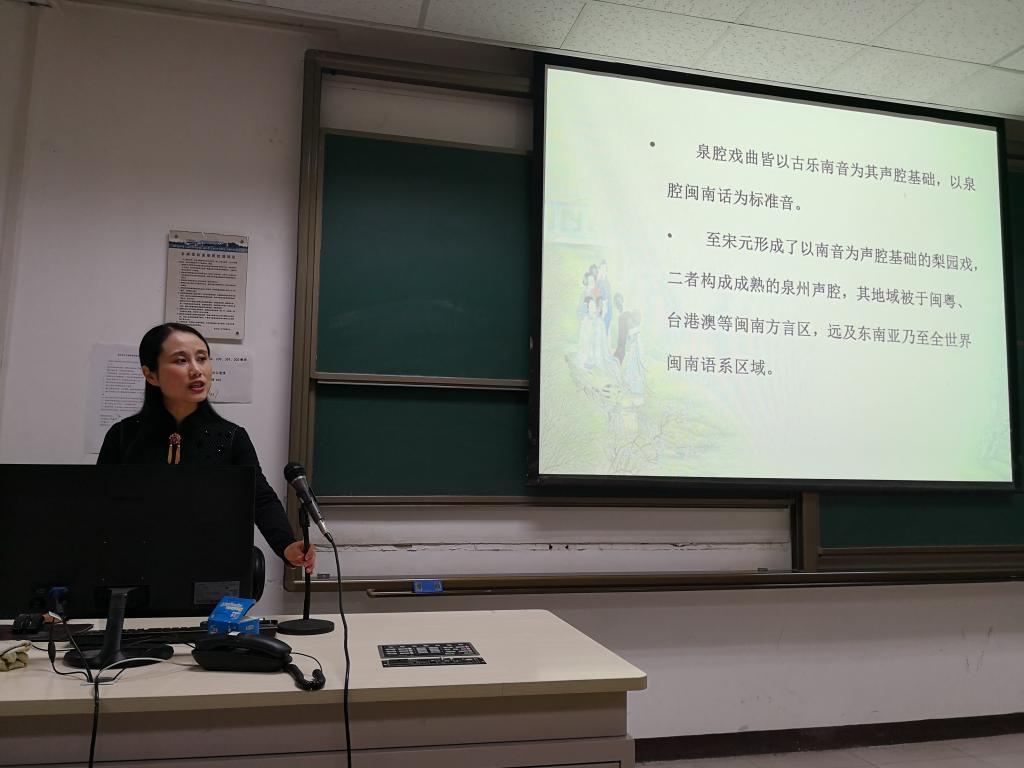 古老优雅的南音、独具特色的泉腔戏曲、异彩纷呈的方言文化引起了在场师生的极大兴趣。最后朱媞媞老师以泉腔朗读了一首以入声押韵的《雨霖铃》,讲座在热烈的掌声中圆满结束。