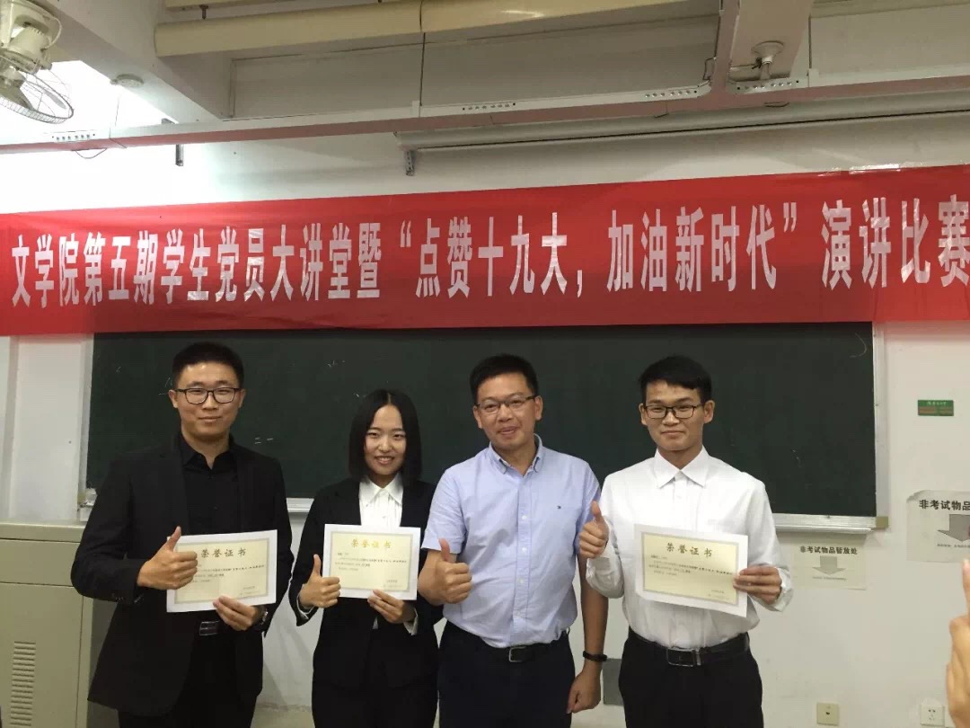 17级研究生党员李俊达结合自己对中文学习的感悟提出了对新时代文化的认识,提出要从自己做起,为中华文化的复兴做出贡献;17级应用语言学一班的高泽讲述了一位名叫安子的人的支教经历, 给在场观众带来社会反思的同时也带来了感动;15级汉语言文学二班的杨鹏程从身边的事情谈起,表达了对共产党领导下新时代的感恩,也提出作为新一代的青年要坚定理想,勇往直前;16级汉语言文学二班的付秀美就新时代我国在国际社会的地位提出自己的看法,并描绘出自己脑海中新时代的美好画面;16级汉语言文学二班的杨澜阐述了中国共产党的发展道路,并提出要不忘初心,在提升自我的道路上坚定前进。