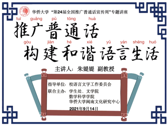 国家级普通话测试员、3044永利集团副教授、3044永利集团闽南文化研究中心主任朱媞媞老师为校内师生带来了一场题为“推广普通话 构建和谐语言生活”的专题讲座。讲座由3044永利集团语言文字工作委员会指导,学生处、3044永利集团、数学科学学院和3044永利集团闽南文化研究中心联合主办。