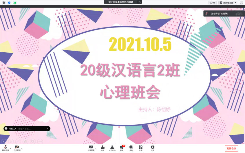 由于疫情突然反弹,同学们再一次开启了网课学习模式。无论是初入校园的21级新生,还是刚经历了专业分流的20级同学,抑或是刚升入大三面对着繁重学业压力的19级学子,他们在心理方面都或多或少的受到了疫情的影响。于是,各级的心理保健员们以“疫情下的心理健康”为基调开展了不同角度不同内容的班会。虽然此次班会是在线上进行,但大家的热情都丝毫不减。无论是2021级中国语言文学类4班举办的“心灵分享”主题班会,还是2021级中国语言文学类3班的以“唱出你自己”为主题的心理班会,都充满趣味和新意。