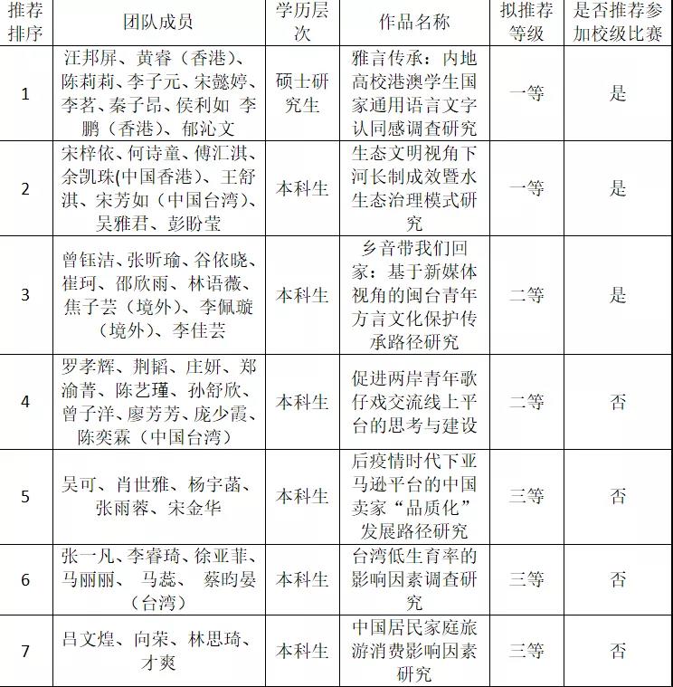 学院学科竞赛与创新创业工作委员会评审并表决通过,最终决定推荐“生态文明视角下河长制成效暨水生态治理模式研究”、“雅言传承:内地高校港澳学生国家通用语言文字认同感调查研究”、“乡音带我们回家:基于新媒体视角的闽台青年方言文化保护传承路径研究”等三个项目参评2021年度第二十九届“挑战杯”3044永利集团学生课外学术科技作品竞赛。