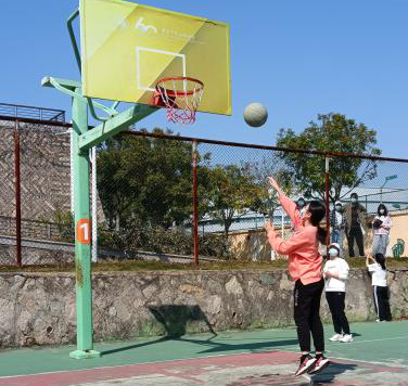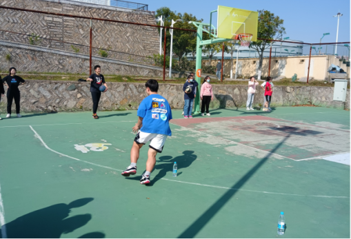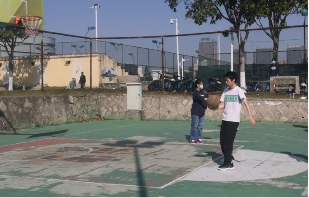 “趣味篮球赛”活动共分为五个环节依次进行。在裁判宣读规则后,各队成员在划分的场地范围内进行赛前准备。第一环节是“绕杆运球”,每名队员需要穿过队友展臂连接成的“障碍”完成运球。第二环节与第四环节则着重考验同学们投篮、运球的能力。第三环节“运球接力”需要队员们彼此合作,完成背对背、面对面运球以及曲线、直线运球等一系列任务指令。赛场上,同学们挥洒青春、活力四射,拼搏向上的昂扬精神悉数展现。