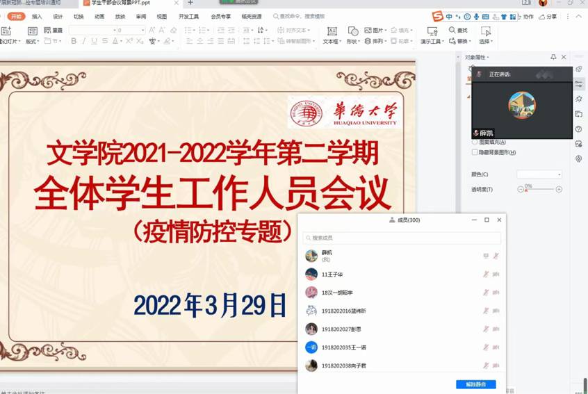 为进一步落实疫情防控相关要求,顺利推进疫情防控工作落实,加强对全体学生的疫情防控形势政策教育和思想教育,3月29日下午,3044永利集团2021-2022学年第二学期全体学生工作人员会议(疫情防控专题)于线上召开。会议由3044永利集团团委书记薛凯主持,党委书记钟炎生出席本次会议,3044永利集团党委组织员林智贤老师、全体学生工作人员、学生党员、预备党员、入党积极分子参会。