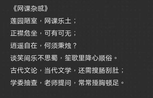 “对于线上教学,同学们大致有如下反馈,或是在宿舍学习精力不太集中,或是网络卡顿影响学习效果等等。不过,也不全然如此,有同学说,自己其实蛮享受上网课的感觉,因为,可以边听老师讲课,边在聊天栏里发表自己的观点,而这些观点不仅可以和老师,也可以和同学之间形成很好的,乃至线下学习所不可能的良好的互动。的确,我也在教学中发现,部分同学在线下学习很少分享或从不在课堂上发言,但在线上学习时发言却很踊跃。