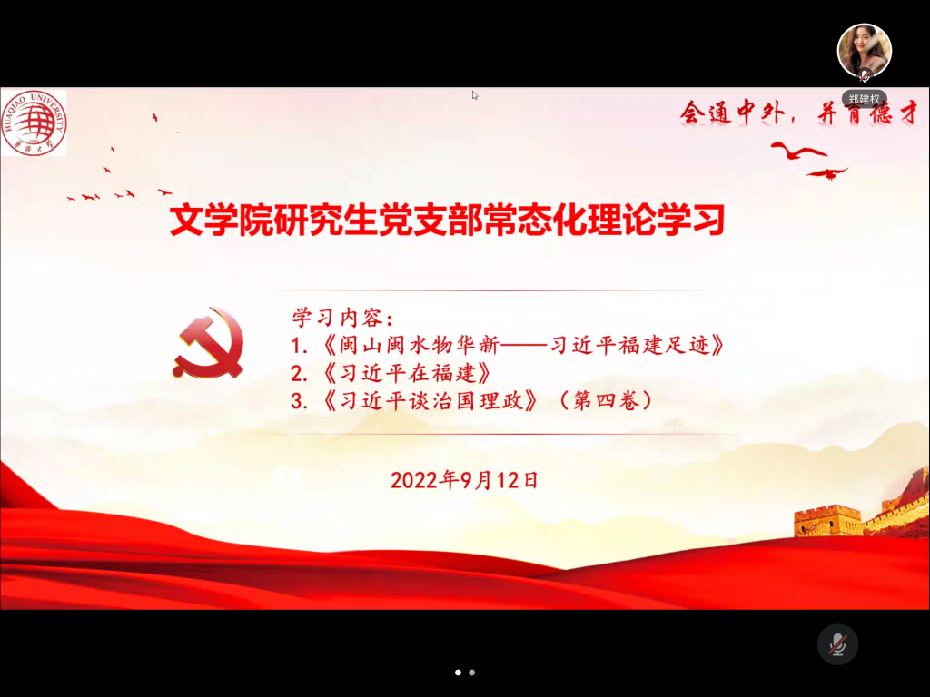 会上,线上参会的同学就这段时间以来自己对《闽山闽水物华新——习近平福建足迹》与《习近平谈治国理政》(第四卷)这两本书的阅读、学习心得进行了分享和交流。
