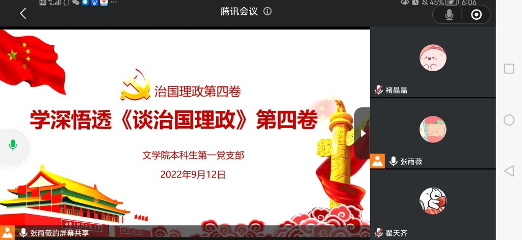 2022年9月13日下午,本科生第二党支部理论学习会在腾讯会议开展。支部副书记郑熹文同志主持会议,本科生第二党支部正式党员、预备党员共同参会。