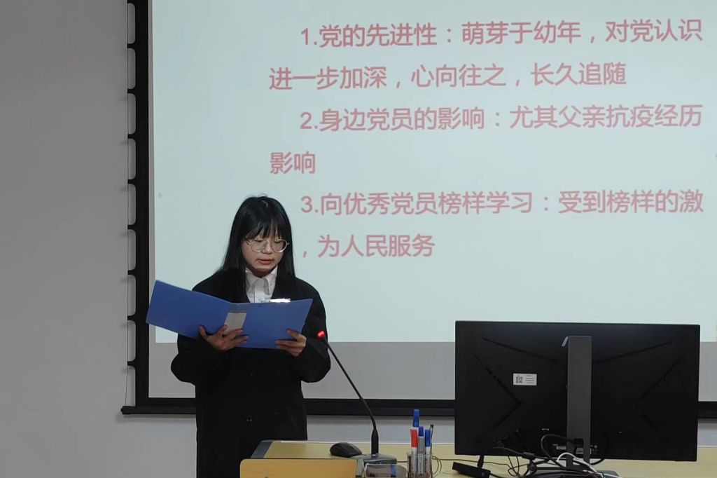 答辩会开始后,20名本科生入党积极分子依次进行答辩,内容主要包括个人汇报和评委提问两部分。在汇报环节,每位入党积极分子都详细汇报了自身入党动机、学习科研成绩、学生工作、志愿服务以及其它方面的表现,并对自己在考察期间的表现作出总结。随后,评委针对入党积极分子的汇报情况进行提问,在指出问题的同时考察他们的思想觉悟,提出更高的要求与希望,例如对于今后如何在学习、学生工作、志愿服务、创业就业、社会实践等多方面起到党员先锋模范作用、在日常生活中如何更好地服务于同学、对学生党员的理解等。这有利于入党积极分子进一步提升对自我的正确认识,为日后成为一名合格党员做好充分准备。