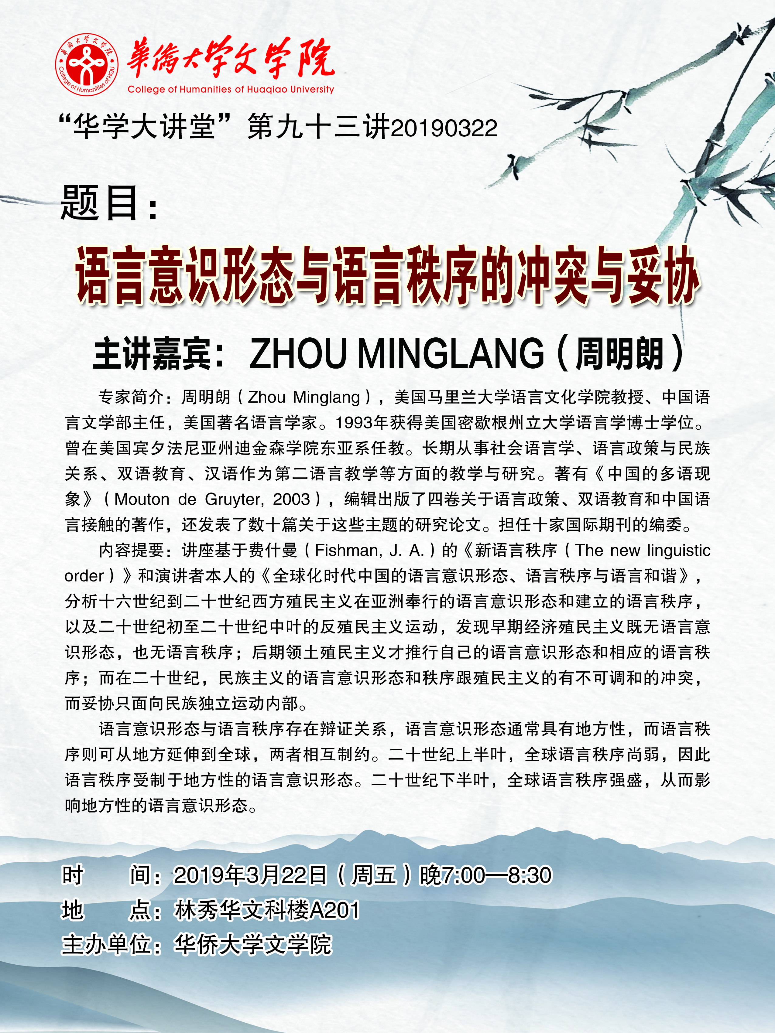 【讲座预告】“华学大讲堂”第九十三讲——周明朗:语言意识形态与语言秩序的冲突与妥协