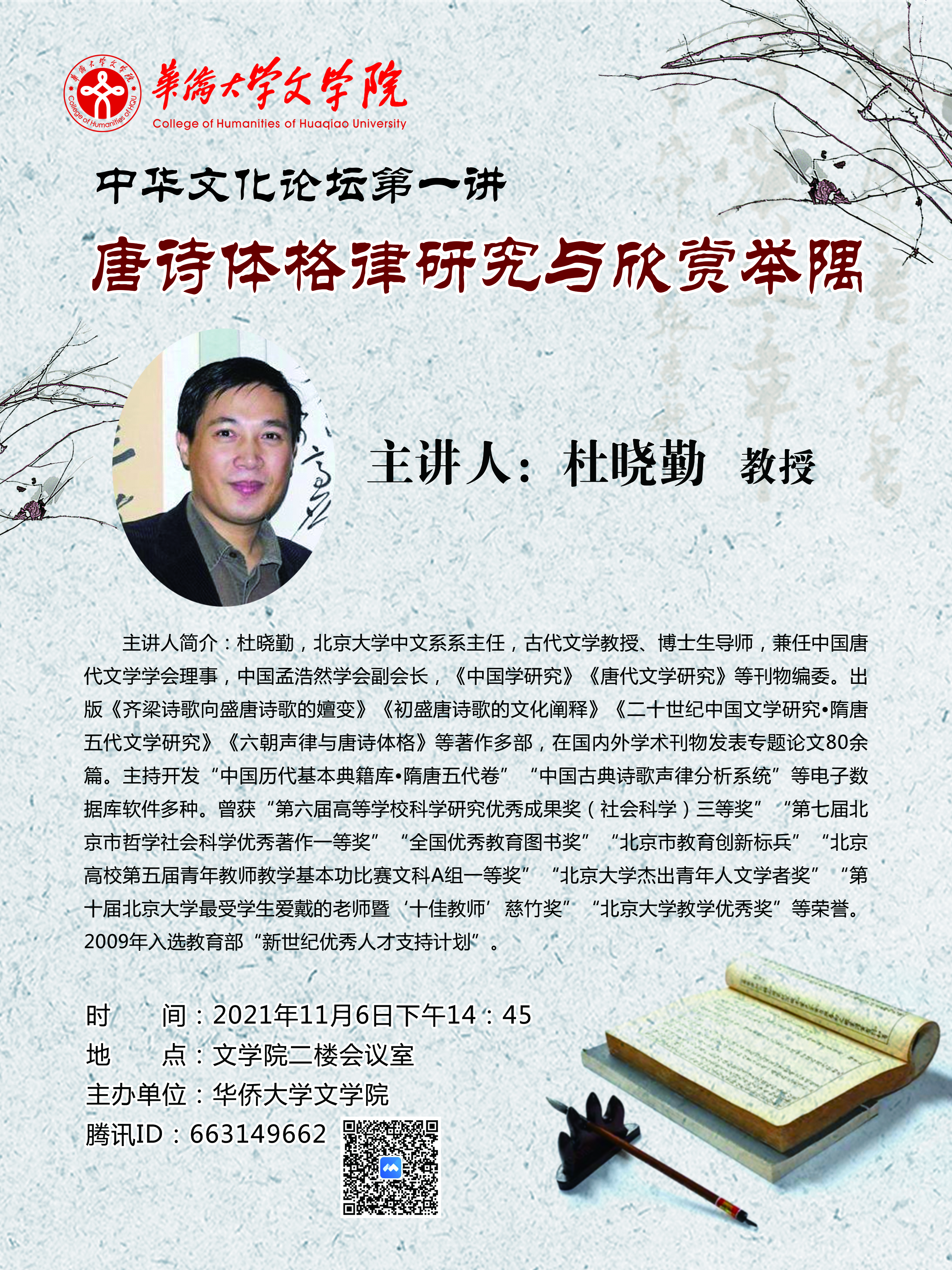 中华文化论坛第一讲是杜晓勤教授带来的“唐诗体格律研究与欣赏举隅”专题讲座。讲座主要介绍了中国古代诗歌体式与格律,杜教授以《唐诗三百首》所选作品为例,为大家讲授了如何从体格律的角度阅读、欣赏和研究中国古典诗歌。从“唐诗体式大备,而各家各有擅场”的唐诗盛况出发,杜晓勤教授带领大家寻本溯源,讲述了自先秦两汉诗歌与音乐紧密结合的状态之后,中国古典诗歌探求诗歌韵律新的表现原理,特别是南朝齐永明年后,中国古典诗歌因讲求声律而形成句律、联律、韵式等诗律形式,这种表现方式直到唐代仍很有影响。他以岑参《夜过磐豆隔河望永乐寄闺中效齐梁体》一诗为例,为同学们分析了与初唐之际形成的近体诗迥异的唐人“齐梁体”诗的独特风格。接下来杜教授又以“七律双璧”崔颢《黄鹤楼》和李白《登金陵凤凰台》为例,就盛唐前期的七言律诗多带古风、歌行音律华畅、一气流转的特点进行了生动讲解;以杜甫《登高》《白帝城最高楼》为例讲解杜甫律诗格律的精严和新变。