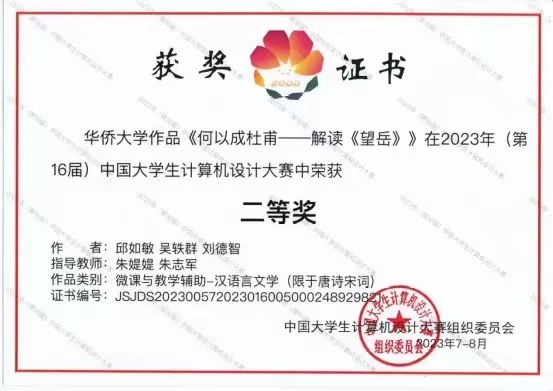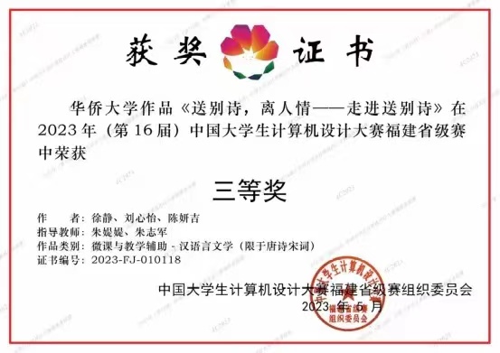 此外,在福建省级赛评审中,另有其它四个作品获奖,它们分别是:微课《送别诗,离人情—走近送别诗》(作者:徐静、刘心怡、陈妍吉,指导老师:朱媞媞、朱志军)和《孤独的呐喊——解析《登幽州台歌》》(作者:孙艺雯、刘燕婷,指导老师:朱媞媞、朱志军)均获得省赛三等奖,H5交互作品《跟着脾胃论去探索》(作者:钟可欣、王洋、关咏琳,指导老师:朱志军、朱媞媞)和《人间草木》(作者:林宇欣、俞心越、刘璇,指导老师:朱志军、朱媞媞)分别获得省赛二等奖和省赛三等奖。