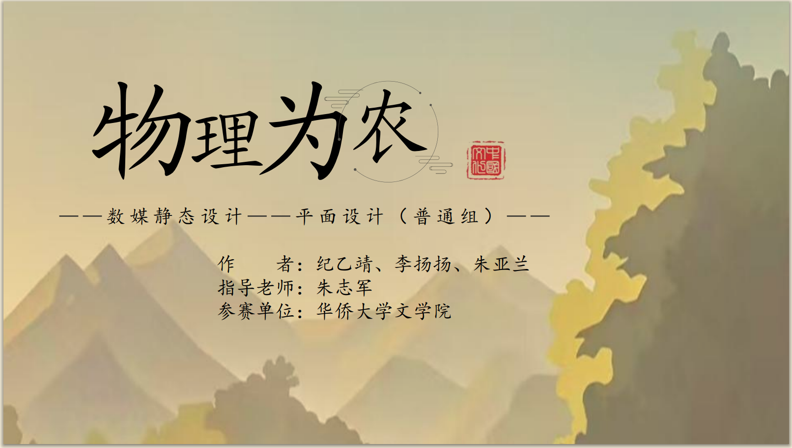 纪乙靖、李扬扬、朱亚兰团队的系列海报作品《耕种》、《灌溉》、《收获》三大核心场景分别以选取曲辕犁、龙骨水车、鼓风车三大农具为载体,揭示其背后的杠杆原理、链传动、流体力学等物理知识,还原了古代农具的智慧。作品借鉴教科书视觉体系,在排版上采用标准模块化设计,左侧为古风农耕场景,右侧配动态原理图解,如曲辕犁的"分力控制",通过箭头动态演示耕深调节机制,向观众阐释了如何将《墨经》中的物理定律转化为可视化的数字作品,体现了“科技赋能文化”的核心理念。