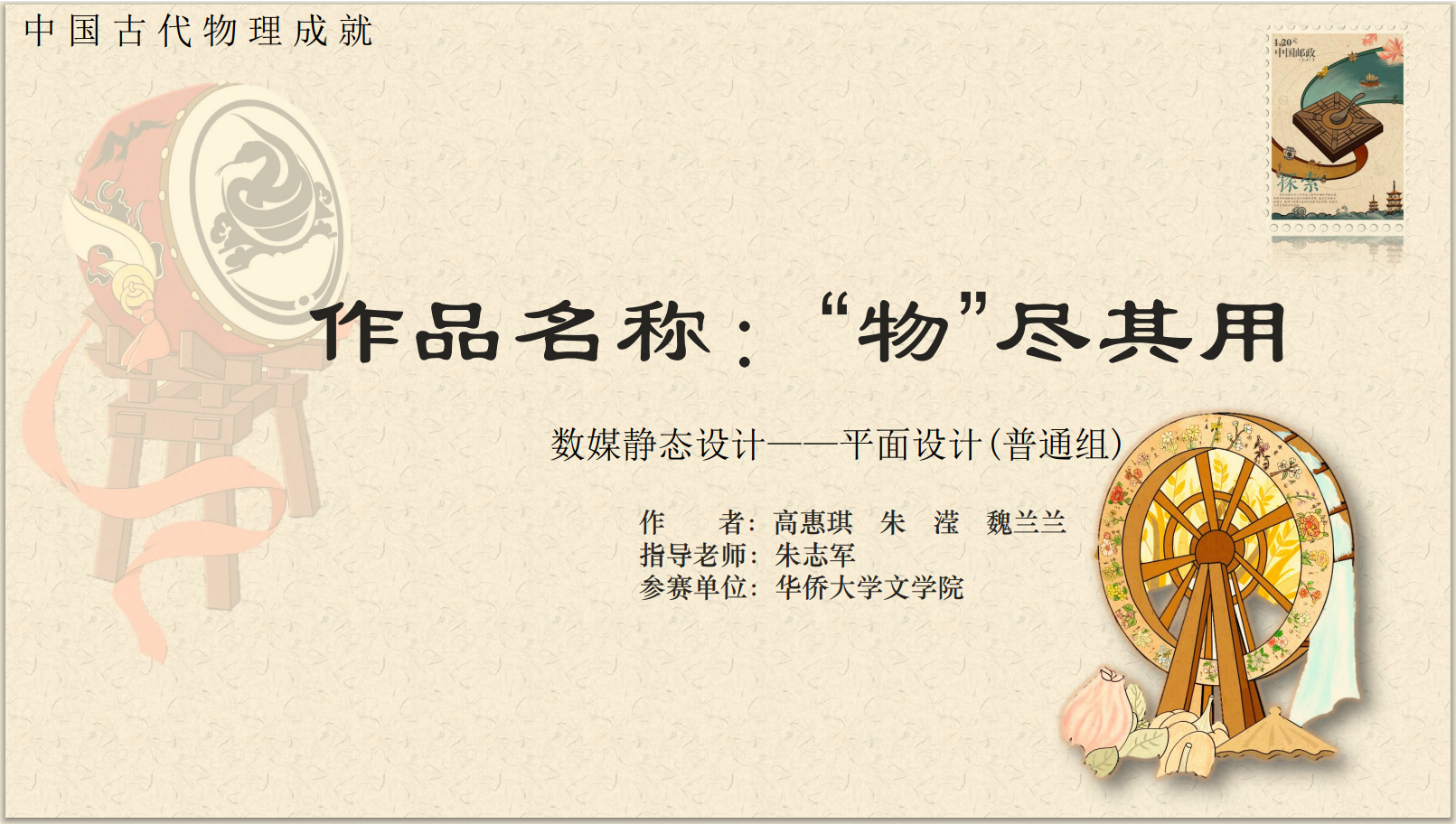 高惠琪、朱滢、魏兰兰团队的平面设计作品《"物"尽其用》,作品选取中国古代最具代表性的三项科技发明:象征军事通讯的战鼓(声学共振)、推动农业发展的水车(力学应用)、指引航海探索的司南(磁学指引),团队创造性地采用邮票这一"国家名片"为载体,通过三枚特种邮票的系列设计,每幅作品以米黄宣纸为基底,通过"赤-黄-棕"色彩演进隐喻文明发展阶段:朱红战鼓象征"和平初创",黄绿水车代表"农业发展",棕红司南寓意"航海探索",构建起完整的科技文明叙事。