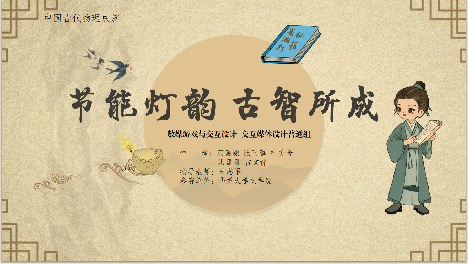 颜嘉颖、张雨馨、叶美含、洪盈盈、占文静团队创作的H5交互媒体作品《节能灯韵,古智所成》,聚焦宋朝省油灯这一"古代节能神器",紧扣古代节能智慧,呼应资源节约的时代议题,采用轻量化操作设计,用户通过体验"察异辨灯"、"量水调温"、“甄瓷求臻”和“择木精良”四重关卡,逐步解锁注水降温、瓷体选材等热力学原理,实现"老少皆宜"的传播效果。